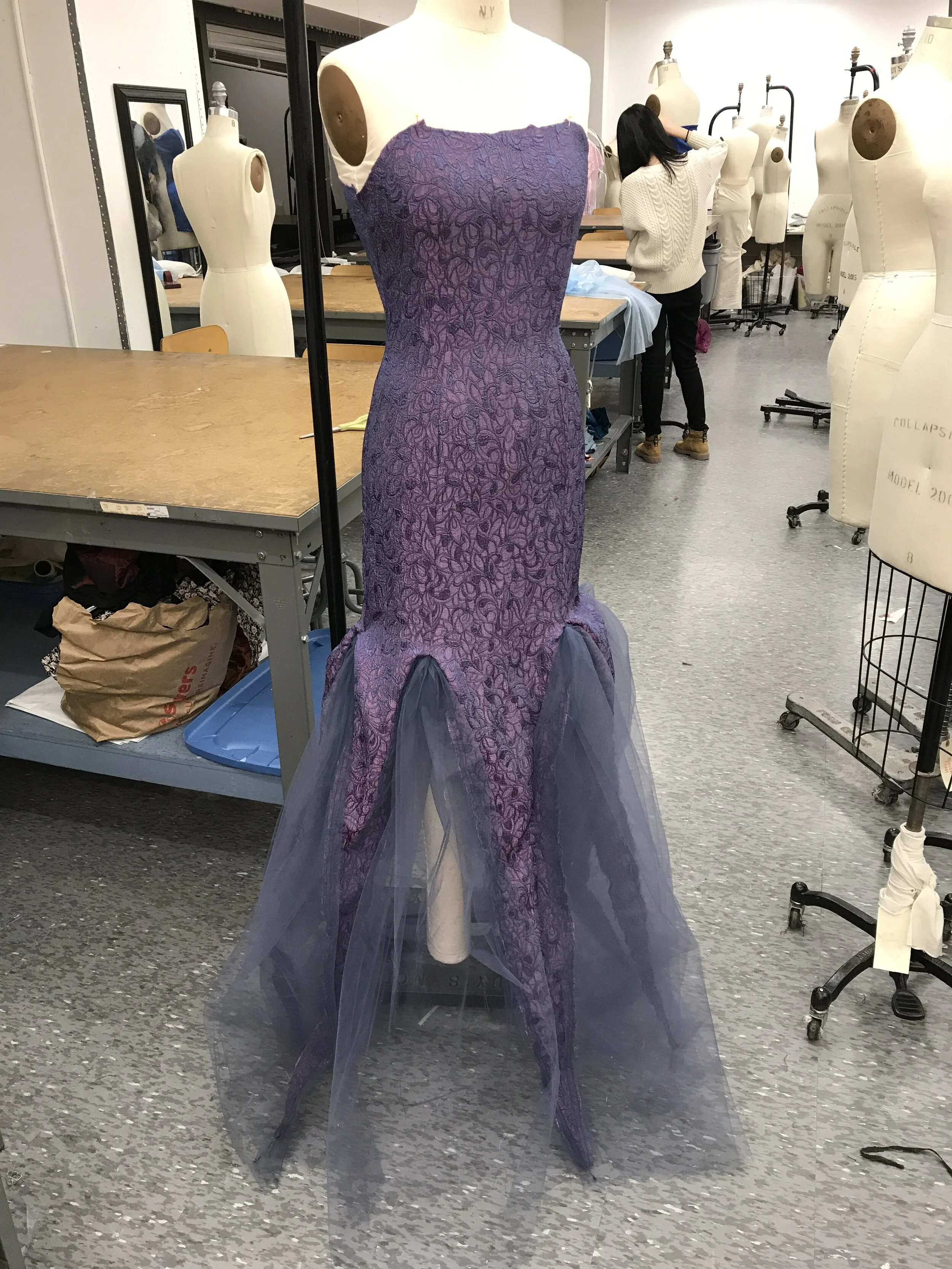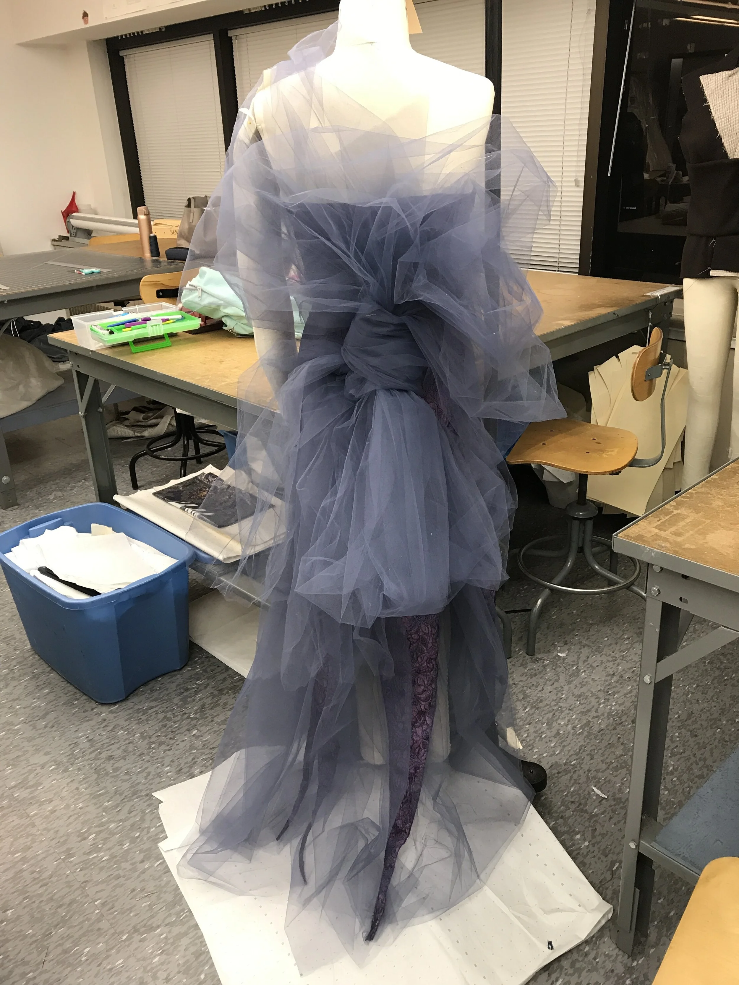 For this look, I was very fabric-drape driven. I played with creating depth in the brocade and exploding the tulle in areas that were organic by the way materials behaved. After having played with the brocade, I decided to keep the silhouette simple for the brocade by letting the tulle take over and especially explode within the godets and back. The color of the tulle picks up and enhances the iridescent cool tone of the brocade. There also is a build in corset structure within the inside of the dress for support.